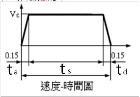 16. 有一單軸螺桿滑台用 AC 伺服馬達驅動,使滑台做往復之直線運動,螺桿導程(Lp)為 5mm,實體減速機構比(i)為 2 ,伺服馬達之分解能(Pt)為 131072 pulse/rev,伺服馬達電子齒輪比(CMX/CDV)為 32768/625,伺服馬達最高轉速限為 3200 rpm,若控制條件:(1)滑台移動距離(S)為 240mm (2)滑台移動時間(ts)為 4.15 秒 (3)滑台加速(ta)及停止減速(td)時間各為 0.15sec,速度-時間如圖所示,則下列敘述何者正確?