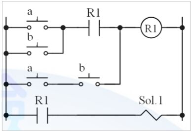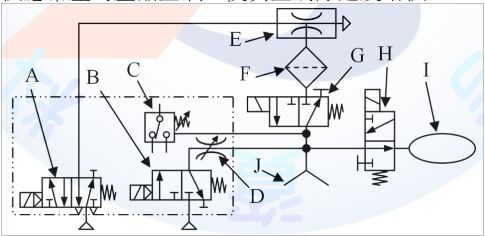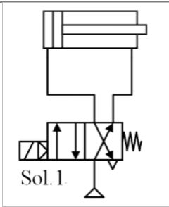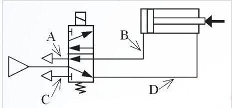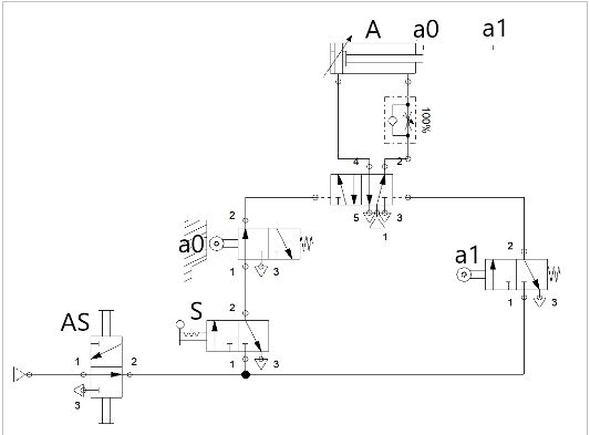(A) 立即切換至原來位置(使產生脈衝訊號)則氣壓缸 A 不會運動 (B) 立即切換至原來位置(使產生脈衝訊號)則氣壓缸 A 伸出後停留在前端位置 (C) 並“鎖”在通的閥位,則氣壓缸 A 連續作往復運動 (D) 並鎖在“通”的閥位,則氣壓缸 A 伸出至端點再退回到原來位置後停止 。