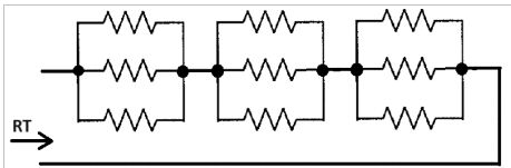 7. 下圖電阻串、並聯圖,若每一個電阻的阻值為10KΩ,請問其等效電阻RT=?