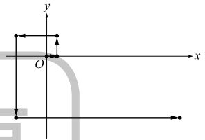 11. 某大學部有一間實驗室,學生為了要研究掃地機器人路徑規劃之成效,將掃地機器人設定為每分鐘直線行走 1 公尺,接著將地面坐標化 (1 公尺為 1 單位),並將其放置在坐標平面上,由原點 O(0 , 0) 出發。首先沿著 x 軸正向 (即正東) 的方向行走 1 分鐘到達點 (1 , 0),然後立即轉向 y 軸正向 (即正北)的方向,再行走 2 分鐘到達點 (1 , 2),然後,再轉向正西方向行走 4 分鐘到達點 (-3 , 2),再轉向正南方向行走 8 分鐘到達點 (-3 ,-6),而後依照正東→正北→正西→正南的方向直線移動,且每次行走的時間是前一次的 2 倍,等速且不考慮轉彎時間,依此規則一直行走下去,如右圖所示。假設早上 8 點開始實驗,由原點 O(0 , 0)出發,關於下列選項中有哪些是正確的?
