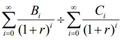 7 若 B 表示利益,C 表示成本,r 表示折現率,i 表示期間,則下列何者是跨期計畫益本比(benefit- cost ratio)評估的計算式? (A) (B) (C) (D)