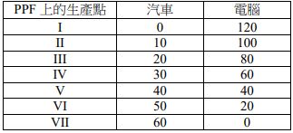 2 下表顯示了某國的生產可能前沿(PPF)上的 7 個生產點,下列敘述何者正確? (A) III 比 II 是更有效率的生產點 (B)生產 30 輛汽車、50 部電腦是可能且有效率的 (C)生產 40 輛汽車、30 部電腦是可能但是沒有效率的 (D)生產 60 輛汽車、0 部電腦是可能但沒有效率的