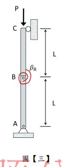 四、如圖【三】所示,二剛性桿AB以及BC,在B點由旋轉彈簧連接。旋轉彈簧常數= 8.5k? ∙ m/rad,桿長L=1.8m。計算此結構系統的臨界負載
