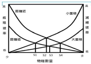 2.附圖為島嶼生物地理學的理論圖型,主要是以島嶼距離大陸塊的遠近及面積的大小,來探討島嶼上物種的拓殖率 (colonization rate)及滅絕率(extinction rate)。試問下列敘述,哪些正確?(A)島嶼上的物種數與島嶼的大小成正比,而與距離大陸的遠近成反比(B)大島嶼因生存競爭激烈,因此較小島嶼的滅絕速率高(C)島嶼上的物種數目增加時,新物種的移入速率會減少(D)較小面積的島嶼不易發生偶發事件使物種滅絕,故滅絕率較低(E)相同面積的島嶼,與大陸較近者有較高的遷入