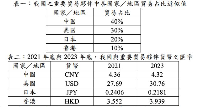 二、將 2023 年我國最重要之貿易夥伴(依重要性排序為中國、美國、日本、 香港)的貿易總值視為 100%,其中各國家/地區的貿易占比分別為中 國 40%、美國 28%、日本 18%、香港 14%,為分析方便起見,將百分比 中之個位數四捨五入後,貿易占比之近似值如表一。2021 年底與 2023 年底,我國與重要貿易夥伴之匯率如表二。
