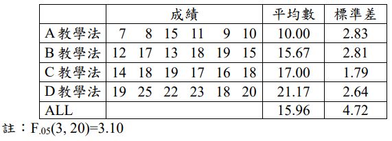 四、某研究生進行了一項研究,以比較四種不同教學方法在數學成績表現上的差異。每一種教學方法下有 6 個測試樣本,總共 24 個樣本,結果如下 表。請計算完成變異數分析摘要表並解釋其結果。
