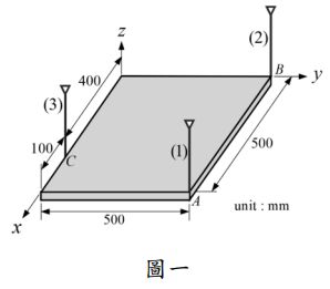 一、圖一所示為一質量 20 kg 的均質正方形平板(500 mm×500 mm),將 A、 B、C 三點以纜繩吊掛於天花板,使與水平面平行,重力加速度 g = 9.81 m/s2 ,試計算三根纜繩的張力。