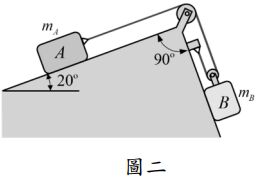 二、質量分別為= 100 kg 及 = 200 kg 之滑塊 A 與 B 初始靜止於圖二所示的斜坡,以纜繩連接兩者懸掛於一個滑輪系統,忽略不計所有接觸面 及滑輪的摩擦力,重力加速度 g = 9.81 m/s2 ,試計算滑塊 A 沿斜坡滑行 2 m 時的瞬間速度=?