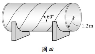 四、圖四所示為一座壁厚 10 mm、平均半徑為 1.2 m 的水平臥式薄壁圓桶壓力容器,由 60° 斜角不銹鋼板銲接而成。若壓力容器的內壓為 1.5 MPa, 試計算垂直於銲縫的平面正向應力及平行於銲縫的平面剪應力值。
