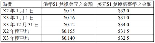 17 X1 年 12 月 31 日甲公司取得香港乙公司 100%普通股股權,甲公司與香港乙公司之功能性貨幣分別為新臺幣與美元,甲公司與香港乙公司之記帳貨幣分別為新臺幣與港幣。X3 年 12 月 31 日乙公司資產負債表之機器設備成本為港幣$320,000,包含機器設備 A 與 B 且分別於 X2 年 1 月 1 日以港幣$200,000 與 X3 年 1 月 1 日以港幣$120,000 買入;機器設備 A 與 B 均採直 線法提列折舊且皆無估計殘值,其估計耐用年限分別為 10 年與 8 年。有關港幣與美元,美元與新臺幣的兌換匯率如下:
