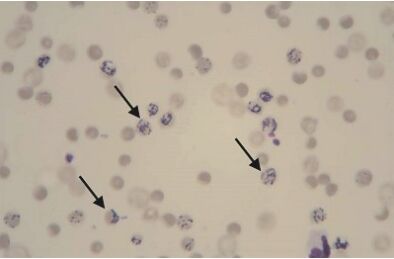 17.下圖為新亞甲基藍染色之犬隻血液抹片,箭頭所指最可能為何種血球? (A)reticulocyte (B)neutrophil (C)eosinophil (D)platelet