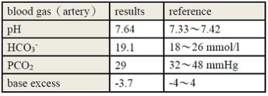 76.11歲雌性已絕育混種犬採動脈血液氣體結果如下表,該犬的血液酸鹼結果下列何者正確? (A)代謝性鹼中毒有呼吸代償 (B)呼吸性鹼中毒無代謝代償 (C)呼吸性鹼中毒有代謝代償 (D)代謝性鹼中毒無呼吸代償