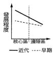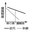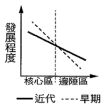9. 宜蘭過去因交通不便,使得有許多企業裹足不前,不管任何行業發展,都遭到嚴重的阻礙與挫折。民國96年北宜高速公路終於在鄉親們的多年期待下通車,通車至今可明顯看出北宜交通革新對當地人口成長趨勢產生的影響(參看下圖(一)),若以雙北為核心區,宜蘭為邊陲區,北宜高通車後雙北與宜蘭間人口變化關係,較適合用下列哪一組核心、邊陲理論解釋之? (A)(B)(C)(D)