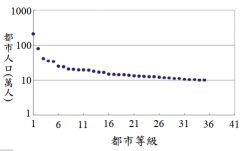 11. 下表(一)為某假想國家前五大都市的連鎖商店數量。各城市的展店的人口標準大致相同。請問該假想國的都市規模分布型態,較接近選項中的哪種類型?(A)(B)(C)(D)