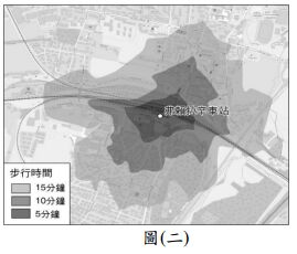 12. 零售業和服務業在進行選址時,通常會收集人 潮流動的數據、與大眾交通工具的距離、同業競爭家數等,以確保獲利。圖(二)為研究者以 德國東南部的弗賴拉辛(Freilassing)車站為核心,模擬從該車站向外步行 5 分鐘、10 分鐘與15 分鐘的範圍,以作為車站商圈範圍規劃的參考。若要獲得圖中的空間範圍,最適合運用哪 項空間分析? (A)地形分析 (B)疊圖分析 (C)環域分析 (D)服務區分析。