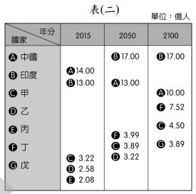 13. 表(二)為中全球未來人口最多的國家預測,除 了中國與印度外,甲、乙、丙、丁、戊依 序為哪些國家? (A)美國、印尼、巴西、奈及利亞、剛果。 (B)美國、巴西、印尼、奈及利亞、剛果。 (C)巴西、美國、印尼、奈及利亞、剛果。 (D)奈及利亞、剛果、美國、印尼、巴西。