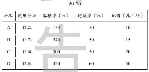 14. 表(三)是高雄市四個地點的土地使用分區管制與地價。在同樣的購地支出下,哪個地點可以獲得最大的總樓地板面積? (A)A (B)B (C)C (D)D