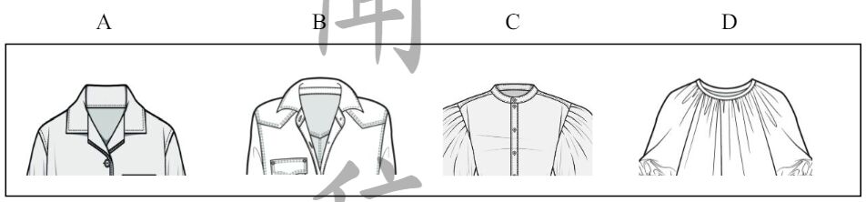 21. 見圖示,請選出袖型為何?(A) 和服袖 (B) 拉克蘭袖 (C) 落肩袖 (D) 連肩袖