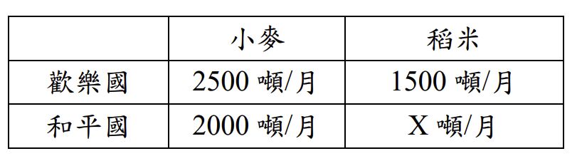 45. 附表為歡樂國與和平國在小麥與稻米的生產情形,若依據比較利益原則,兩國的分 工情形由歡樂國專職生產稻米,和平國專職生產小麥,據此判斷和平國一個月可能 可以生產的稻米噸數為何? (A) 2000 噸 (B) 1400 噸 (C) 1250 噸 (D) 1080 噸