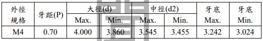 33. 某機械螺絲的規格如下表,若要在鋁材上攻其螺絲牙孔,則需先鑽直徑多少的孔? (A) 3.8mm (B) 3.5mm (C) 3.3mm (D) 3mm