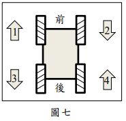 39. 圖七是裝載麥克納姆輪車體簡圖,若四輪旁的箭頭代表輪毂動力方向,則車體目前處於何種運動狀態? (A) 右轉 (B) 右橫移 (C) 右後斜移 (D) 右前斜移