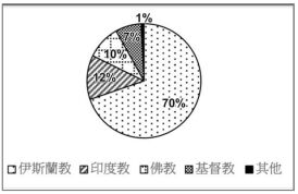 28. 右圖為亞洲某國居民的主要宗教信仰圓餅圖。該國最有可能為下列何者? (A)緬甸 (B)泰國 (C)孟加拉 (D)尼泊爾