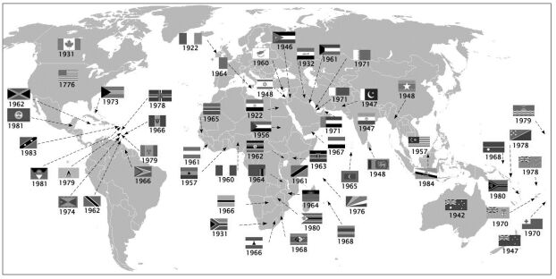 32. 圖為某個國家殖民地的獨立年代圖。該國首都距離哪條經線最近? (A)0˚ (B)10˚W (C)10˚E (D)20˚W