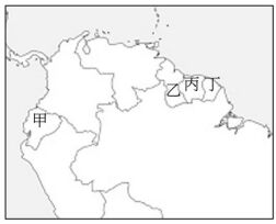 36. 2010 年時某個位於南美洲的殖民地曾經進行全民 公投,結果近 70%的選民不願意獨立,因為憑藉殖 民母國的經濟援助,該國在生活水準上已遠超它的鄰國,是南美洲生活水準最高的地區。該地區位於右圖中何處? (A)甲 (B)乙 (C)丙 (D)丁