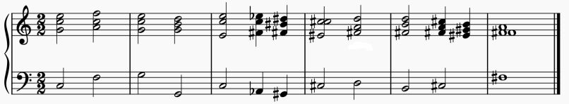 45.下列譜例的轉調方式,何者正確? (A)德國增六和弦轉調 (B)拿坡里六和弦轉調 (C)減七和弦轉調 (D)法國增六和弦轉調