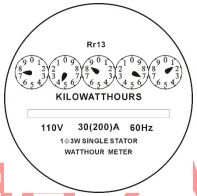 49. 某機械式指針型電表如圖所示,請問下列敘述何者有誤? (A)指針後為5個相接的正齒輪 (B)此電表數字讀為75871 (C)此電表為單相三線式 (D)此電表額定電流為30安培