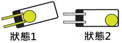 57. 某開關有汙染環境的疑慮,其傾斜或翻轉時,運作狀況如圖所示。請問下列描述,何者有誤? (A)此開關為水銀開關 (B)狀態1的時候會形成迴路,流通電能 (C)此開關可用於偵測設備是否傾斜,如:防盜櫃 (D)內部為可流動的氣體,會沉降到較低的地方