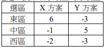 10 假設某議會考慮通過兩項方案 X 和 Y 的立法,其中個別方案對不同的轄區東、中、西區將產生的以下淨收益(以億計)。議會以多數同意決,分案表決。各區皆有 1 張選票,同意或不同意方案的通過,投票以爭取正的淨收益為原則,可以行使選票互助(logrolling)。下列敘述何者正確? (A)兩個方案都可能通過,因為東區和中區可進行選票互助,投同意票(B)只有 X 方案會通過,因為三區的淨效益總合為正(C)兩個方案都不可能通過,因為每一方案都只有一轄區的淨效益為正(D)兩個方案都不可能通過,因為西區會積極反對,以避免方案對其的負效益