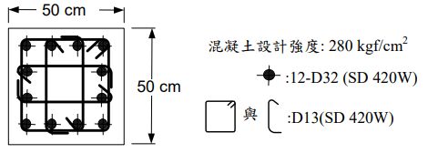 三、斷面 50 cm✕50 cm RC 柱,含地震效應之因數化柱軸壓力 Pu = 220 tf,在塑性鉸區柱斷面配筋如下圖所示。其中,
