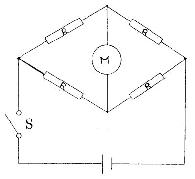 20. 一電路如下圖,如各支電阻 R 均相等,當開關 S 接上時,則電動機M將