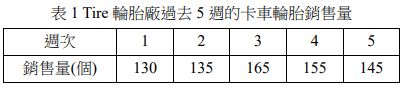2. Tire輪胎廠過去5週的卡車輪胎銷售量如表1,若以指數平滑法(Exponential smoothing method)預測銷售量,且平滑係數(α)為 0.6、第 1 週預測銷售量為 140 個,則第 6 週預測銷售量約為多少個?(A) 144(B) 149(C) 154(D) 159