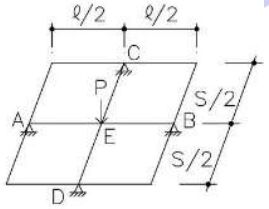 第四題 下圖為格子梁結構系統,AB 梁及 CD 梁之斷面尺寸及彈性模數 E(elastic modulus)均相同,ℓ =2s,E 點承受向下 P 的載重,AB 及 CD 均為鉸支承 (hinge),試計算並繪出 AB 梁及 CD 梁張力側之彎矩圖(M-dia)及剪力圖(Vdia)?另外並請說明此種梁的配置方式是否可以發揮設計格子梁之效益?