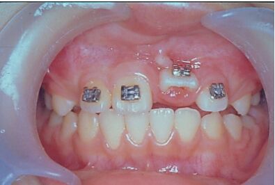 42.5歲半兒童上顎門齒因為齲齒而缺失(如下圖),下列敘述何者錯誤?①需要製作空間維持器 ②需要製作 固定或活動式義齒(fixed or removable prosthetic appliance) ③需要哈立固定器給予治療(Hawley appliance) (A)僅① (B)僅①② (C)僅②③ (D)①②③