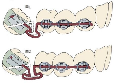 26.在使用T型環(T-loop)協助扶正向前傾倒之第二大臼齒時,兩圖中使用不同的配置,下列敘述何者正確? (A)圖1中的第二大臼齒扶正後主要會發生牙根向前方移動 (B)圖2中的第二大臼齒扶正後主要會發生牙根向前方移動 (C)圖1和圖2中的第二大臼齒扶正後牙冠的位置都會向前移動 (D)圖1和圖2中的第二大臼齒扶正後近心頰側牙尖的高度都會和現在相同
