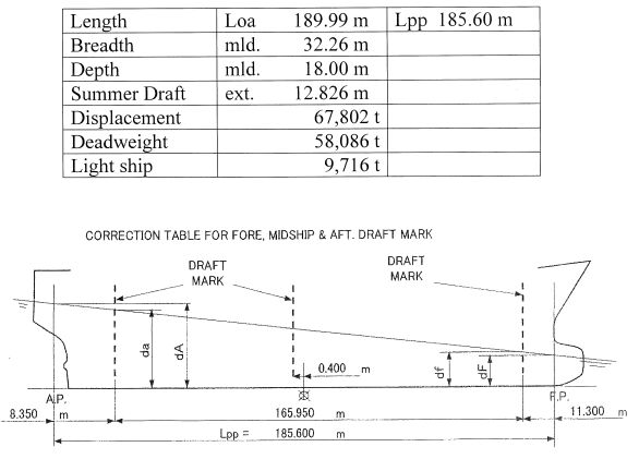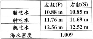 第一題:請依考試用表所附資料計算出精確排水量噸位。說明: 1. 各計算列的吃水數值取至小數點第四位,第五位四捨五入。 2. 各計算列的重量噸數值取至小數點第一位,第二位四捨五入。 3. 注意正負符號,並將詳細計算過程及公式寫在答案紙上。 節錄自考場考試用表,某輪「Loading Manual and Stability Information」 船舶之基本規格及水尺標誌如下:裝貨完畢後取得吃水標誌讀數及海水密度如下,求排水量: