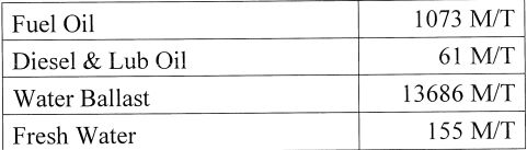 一、船舶進港時水呎為5.126公尺 Even Keel,當港之海水密度為1.005, 船舶貨載及油、水狀況如下,請依考試用表所附資料計算出船舶之 常數(Constant)。