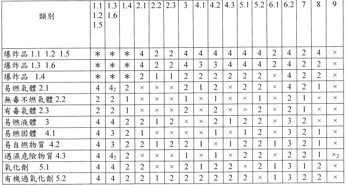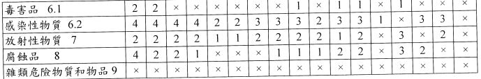 二、下表為危險貨物裝載的隔離表,請解釋表中的數字(1、2、3、4)及 符號(*x)代表何意義?