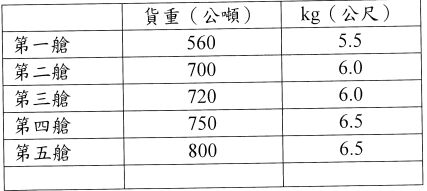 二、某船空船重 5,500 公噸,重心距龍骨 3.8 公尺。裝完貨後,資料如下: