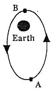 4. A small satellite is in elliptical orbit around the earth as shown. If L denotes angular momentum and K denotes kinetic energy, which of the following statement is correct? (A) LB > LA and KB > KA (B) LB > LA and KB = KA (C) LB = LA and KB = К(D) LB< LA and KB = KA (E) LB = LA and KB > КA