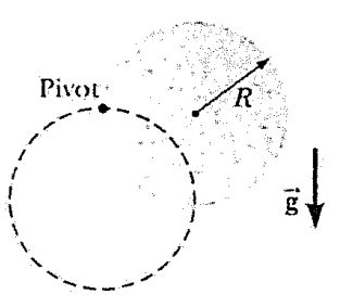 10. A uniform solid disk of radius R and mass M is free to rotate on a frictionless pivot through a point on its rim. If the disk is released from rest in the position shown by the gray-colored circle, what is the speed of its center of mass when the disk reaches the position indicated by the dashed circle?