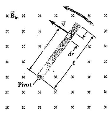 13. A conducting bar of length I rotates with a constant angular speed w about pivot at one end. A uniform magnetic fieldis directed perpendicular to the plane of rotation as shown. Find the motional emf induced between the ends of bar. xBx dr