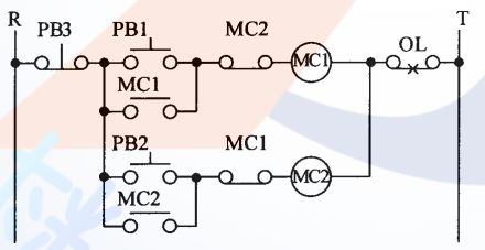 5. 如下圖所示,控制電路可做為一台三相感應電動機 (A)啟動控制 (B) 正逆轉控制 (C)斷續動作控制 (D)ON、OFF 起動控制 。