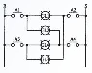 9. 如下圖所示,當 A1 、A4 之接點閉合時 (A)GL1 、GL2 、GL3 、GL4 亮度相同 (B)GL1 較亮,GL2 、GL3 、GL4 不亮 (C)GL2 較亮,GL1 、GL3 、GL4 微亮 (D)GL1 、GL4 亮,GL2 、GL3 微亮 。