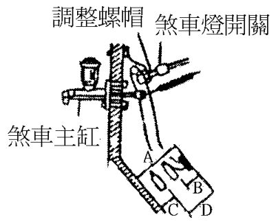 (A)駐車煞車調整 (B)煞車踏板行程之調整 (C)煞車力之檢查 (D)變速箱控制線調整 。