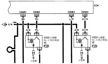 (A)電源線(G/W)為白底灰色 (B)搭鐵線(B)為藍色 (C)NO.4 之訊號線(GY/R)為紅底綠色 (D)NO.2 的訊號線(PU)為紫色 。