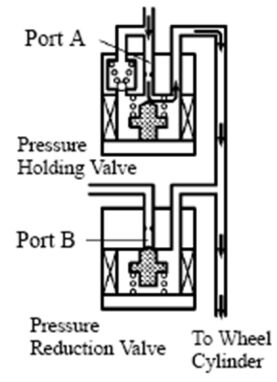 181. 如圖所示為某 ABS 之油路電磁閥回路作用圖,技師甲說:該油路圖顯示系統正在增壓模式;技師乙說:此狀態有可能為正常煞車而防鎖定功能尚未作用,何者敘述較正確?